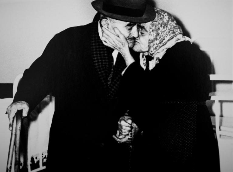 come in una delle sue fotografie più famose, un bacio fra due anziani fragili