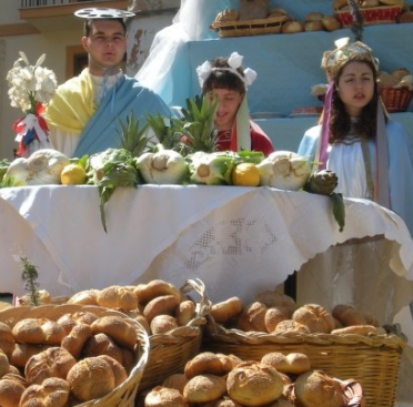 I cibi esposti su questi altari (sia cotti che crudi) possono variare, ma lo schema è sempre quello di una questua iniziale e una redistribuzione ai bisognosi. Immancabili sono comunque il pane, le arance -con il loro significato cosmogonico- e le primizie (gli stessi alimenti trovano spazio anche sui fercoli processionali). Il pane, alimento per eccellenza della tavola, si plasma con le più varie forme che vanno dall’universo naturale, a simboli della sacra famiglia, a parti del corpo del Santo (barba, mano, faccia), agli strumenti del lavoro (che ricordano anche quelli della passione), a simboli cristiani (croci, ostensori, calici) e cosmici (la spirale).
